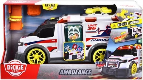 Đồ chơi xe cứu thương này của Dickie Toys có thiết kế với bánh xe màu vàng bắt mắt. Xe đồ chơi cũng đi kèm với một loạt hiệu ứng âm thanh và ánh sáng chân thực (bao gồm 2 pin AA 1,5 V) để tái tạo không khí của một cảnh cứu thương điển hình ngoài thực tế.