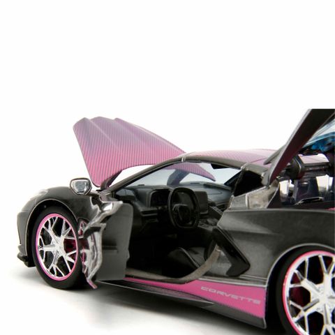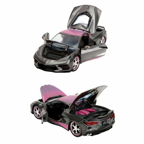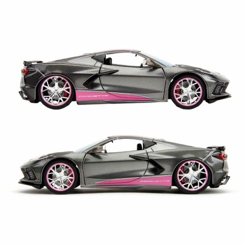 Đồ Chơi Xe Mô Hình JADA TOYS Pink Slips 2020 Chevrolet Corvette Stingray 1:24 nổi bật với thiết kế hiện đại và cuốn hút. Với tông màu xám kết hợp với các chi tiết hồng nổi bật, chiếc xe không chỉ thu hút ánh nhìn mà còn thể hiện phong cách độc đáo và cá tính.