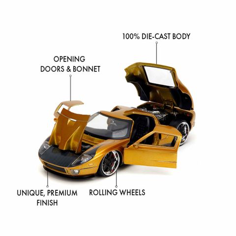 Đồ Chơi Xe Mô Hình JADA TOYS Pink Slips 2005 Ford GT 1:24 nổi bật với màu vàng ánh kim rực rỡ, mang đến vẻ đẹp sang trọng và cuốn hút. Thiết kế kiểu dáng độc đáo với các đường nét mạnh mẽ và tinh tế, thể hiện sự kết hợp hoàn hảo giữa phong cách và tốc độ. Phần mui xe màu đen tạo nên sự tương phản nổi bật, làm tăng thêm điểm nhấn cho mô hình. Với chất lượng hoàn thiện tỉ mỉ và sự chú trọng đến từng chi tiết, đây không chỉ là một món đồ chơi mà còn là một tác phẩm nghệ thuật tuyệt vời, cho những ai đam mê xe hơi và muốn nâng cao bộ sưu tập của mình.