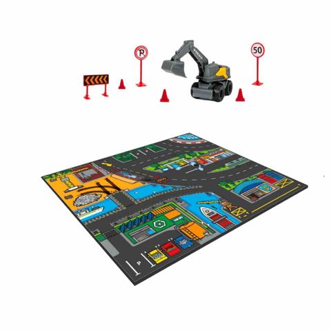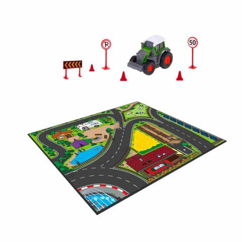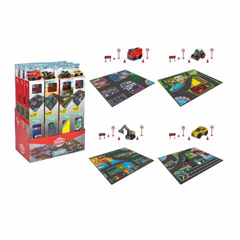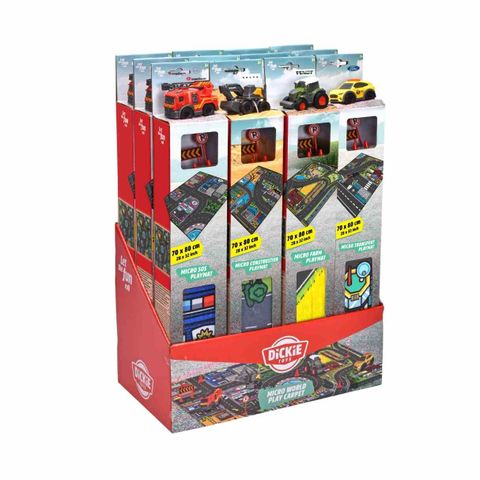 Bộ Đồ Chơi Xe Thảm Sàn Thành Phố DICKIE TOYS Micro World Playmat là một thảm trải sàn hình thành một bản đồ thành phố hoặc cảnh quan thu nhỏ, được ghép nối từ 4 mảnh vuông nhỏ. Trên thảm được in họa tiết đường sá, các tòa nhà, công viên, trang trại, và nhiều chi tiết khác của một thành phố sống động. Sản phẩm thường đi kèm với các mô hình xe đồ chơi nhỏ để trẻ em có thể di chuyển và tương tác trên bản đồ.