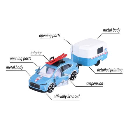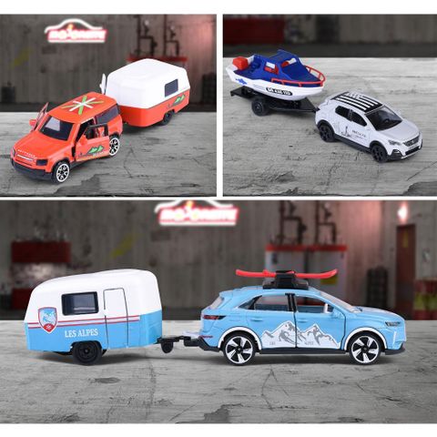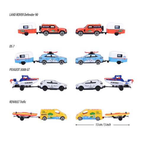 MAJORETTE French Touch Trailer gồm 4 mẫu xe khác nhau: PEUGEOT 3008 GT + Boat Trailer, LAND ROVER Defender 90 + Eriba Puck, DS7 + Eriba Puck, RENAULT Traffic + Kayak Trailer. Một số chi tiết xe có thể mở ra như cửa, nắp capo... giúp mẫu xe thêm chân thật hơn.